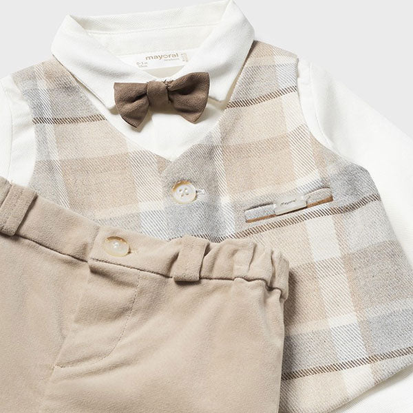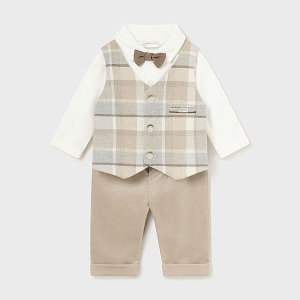 This original two-piece set for newborns features a charming long-sleeve shirt with a classic collar and an adjustable, removable bowtie. The shirt showcases a simulated vest design layered over a unique combination of fabrics, creating a special look. The coordinating newborn pants feature an elastic waistband with adjustable inner buttons for a perfect fit, crafted from warm and soft corduroy for ultimate comfort. Finished with a cuffed hem, this stylish set is ideal for dressing your little one for any occasion.