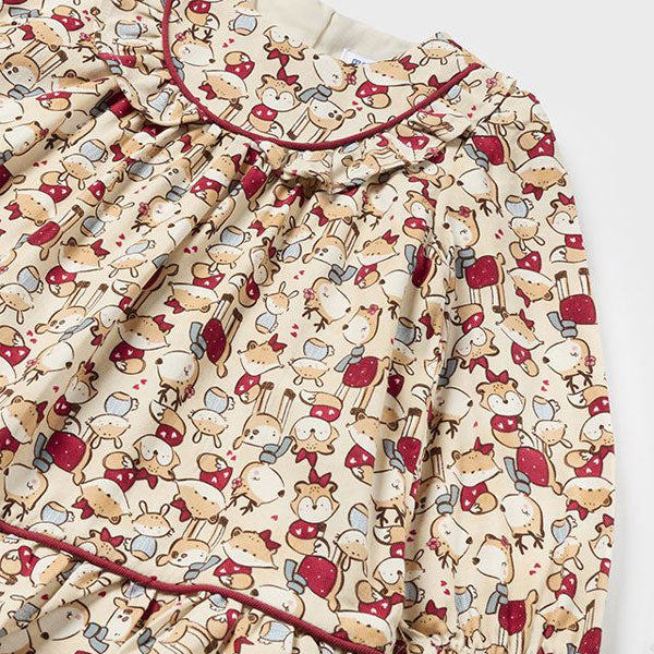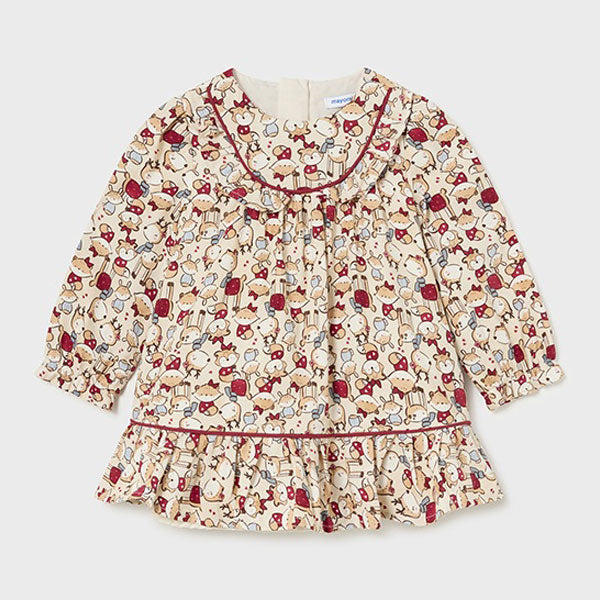 Keep your little one cozy and stylish in this adorable long sleeve dress! Featuring elastic cuffs and a convenient invisible back zipper for easy dressing, this dress is made from warm fabric, perfect for chilly days. With charming ruffles and a decorative hem ruffle, it brings a playful touch to any outfit. The delightful printed design adds an extra flair, making this dress ideal for special occasions or fun outings. Your baby will be the center of attention wherever they go!
