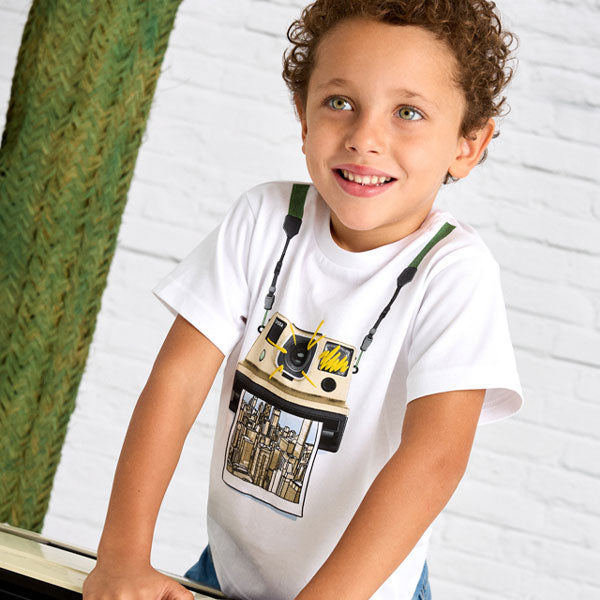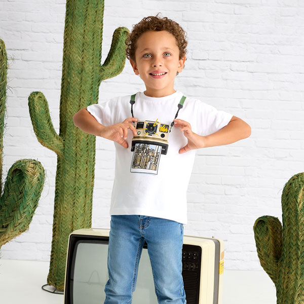 Short-sleeve t-shirt for boy. Round neckline. Decorative elements: ribbed details, screen print. Printed design.