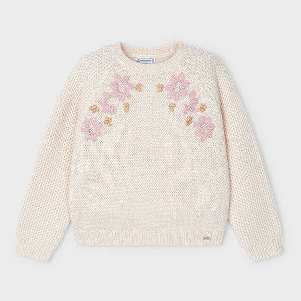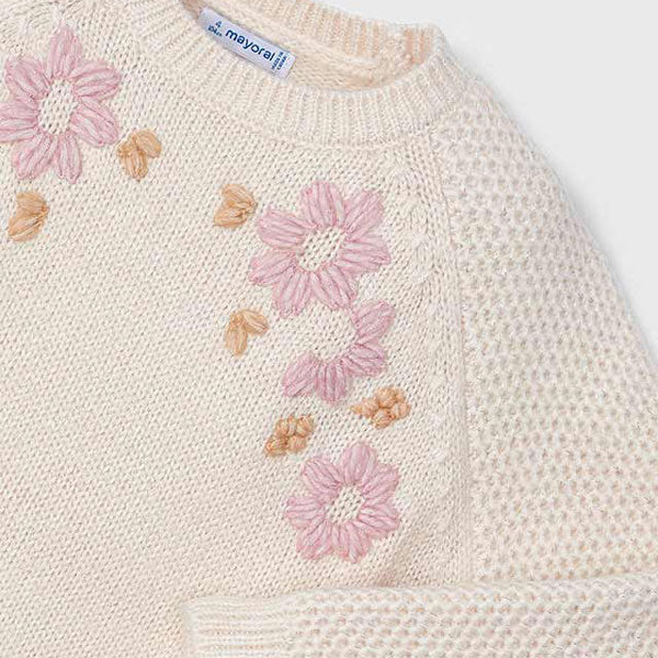 This sweater for girls is made with recycled polyester, combining sustainability with style. It features a cozy design with elastic knit at the hem, cuffs, and neckline for a better fit, and is adorned with charming embroidery details, making it a perfect choice for eco-conscious fashionistas.