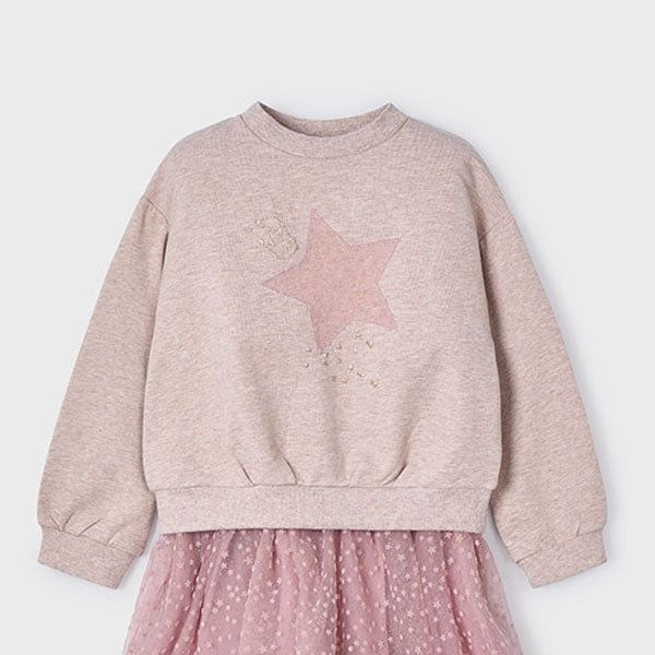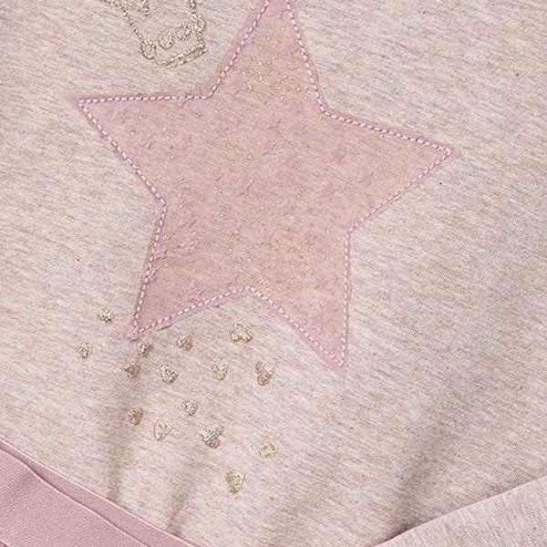 This charming sweatshirt featuring puffed sleeves, crafted from warm, thick brushed fleece, perfect for colder months. It is adorned with decorative appliqués and metallic details, adding a touch of sparkle and style.