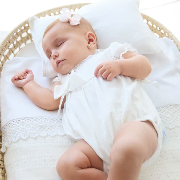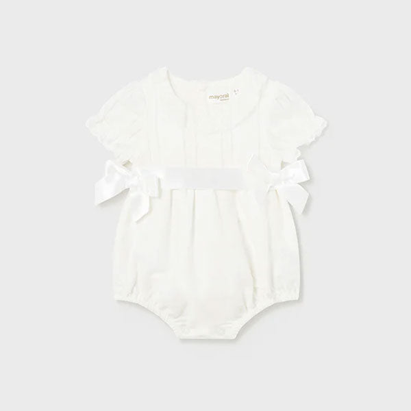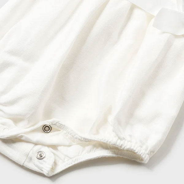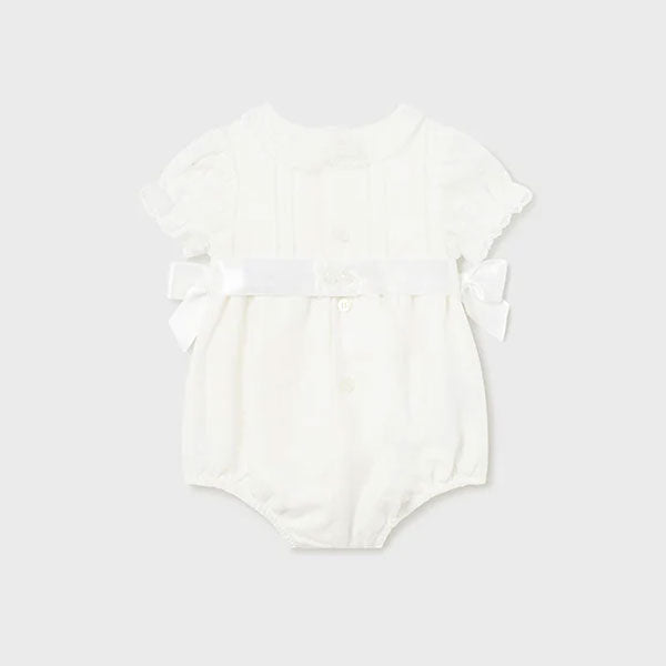 Short sleeved One-Piece for newborn. Round neckline with ruffles. Snap button closure at crotch for easy putting on and taking off. Button fastenings down the back to allow the garment to be put on and taken off easily.