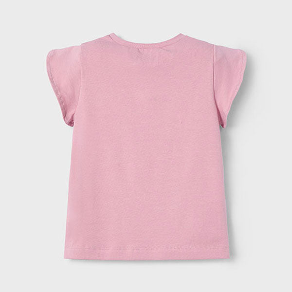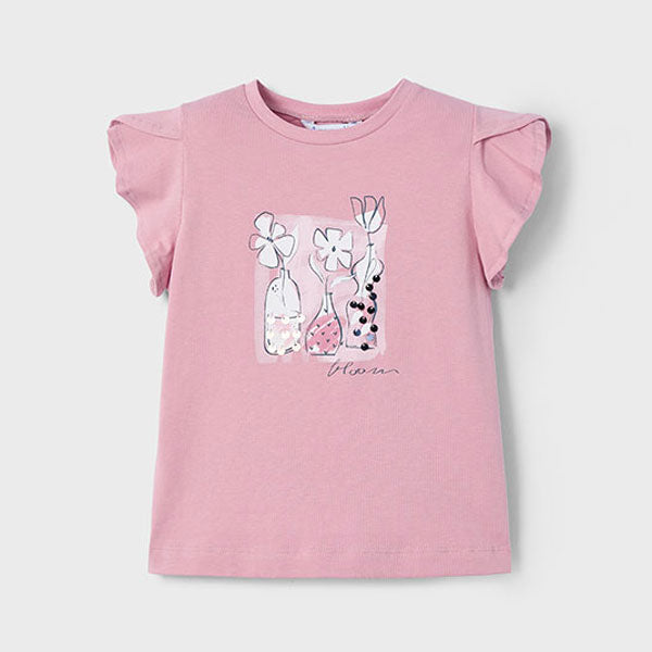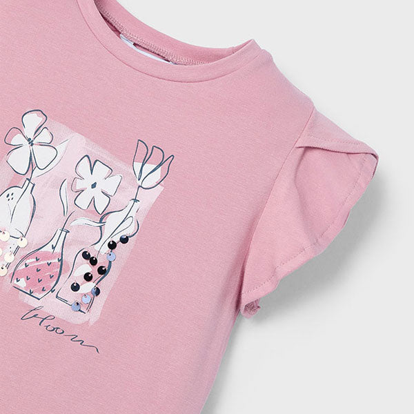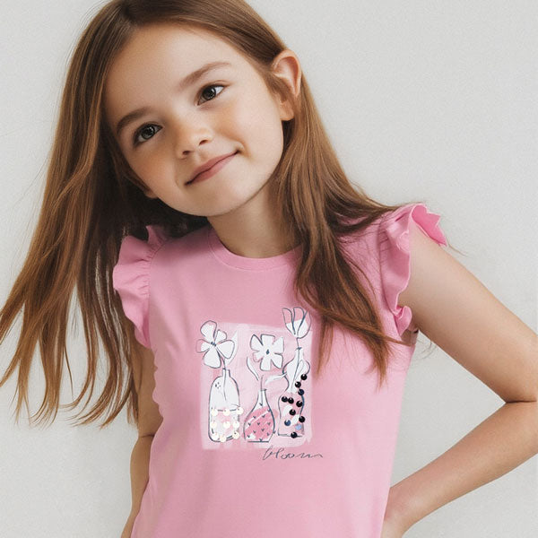 Short-sleeve t-shirt for girl with ruffle details. Decorative element: print on the front.